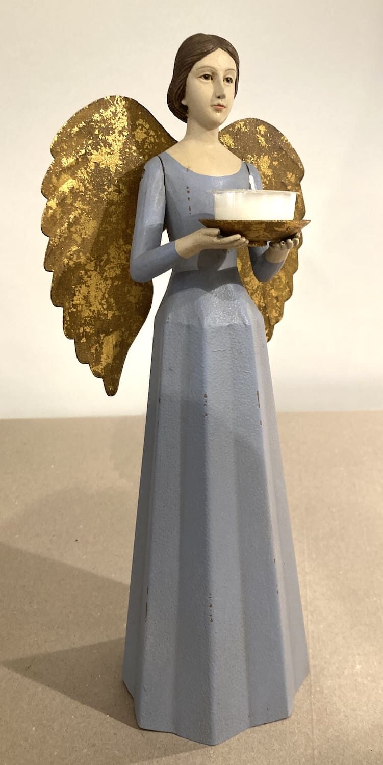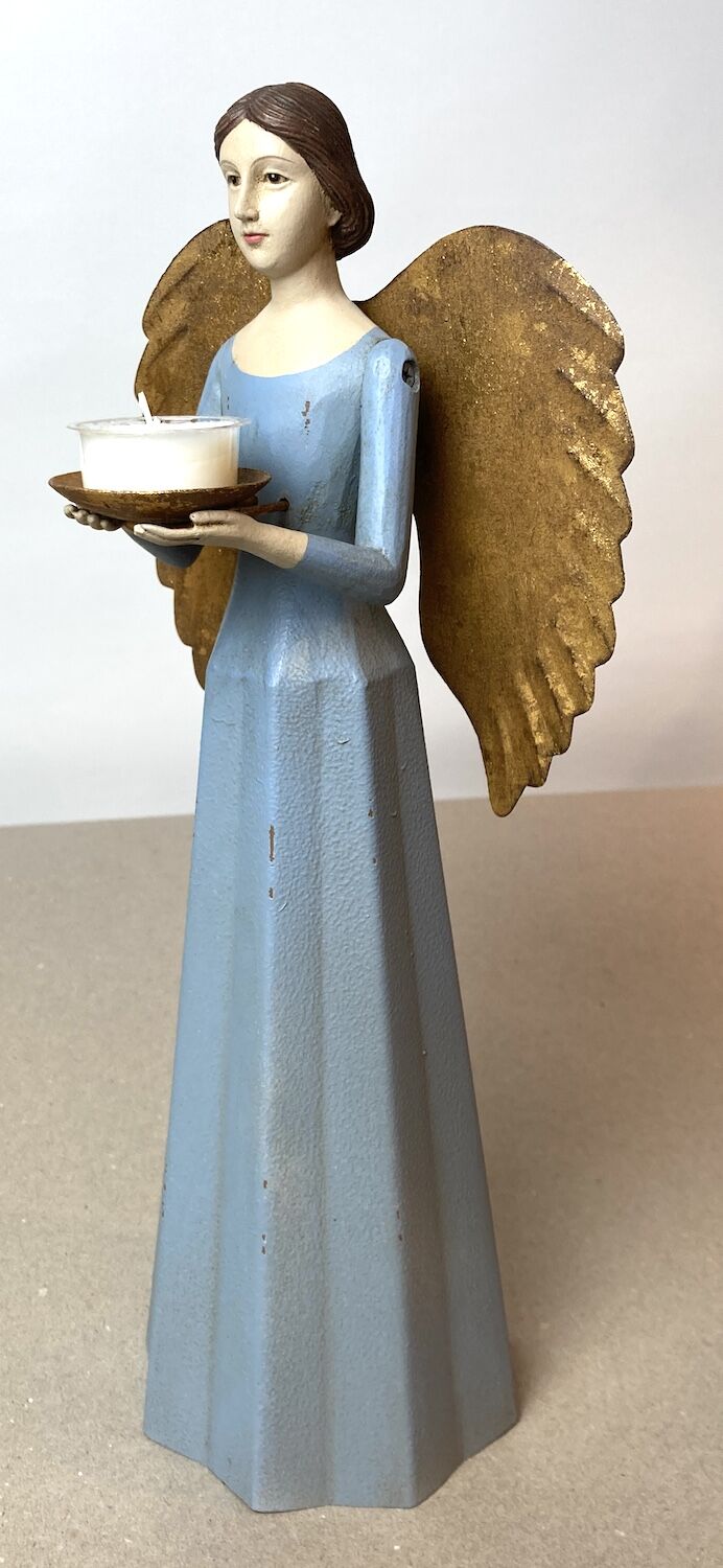 Die Figur ist handgemalt, was besonders dem anmutigen Gesicht einen eigenen, feierlich-ernsten Charakter verleiht. Der ungleichmäßige Farbauftrag unterstreicht den nostalgischen Charakter der Figur und erzeugt einen angenehmen Antik-Look. Flügel, Schale und Rock sind aus Metall, Arme und Kopf aus Kunstharz in Holzoptik.