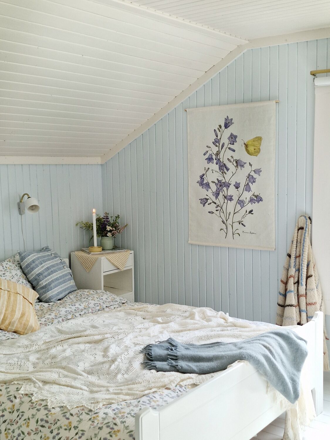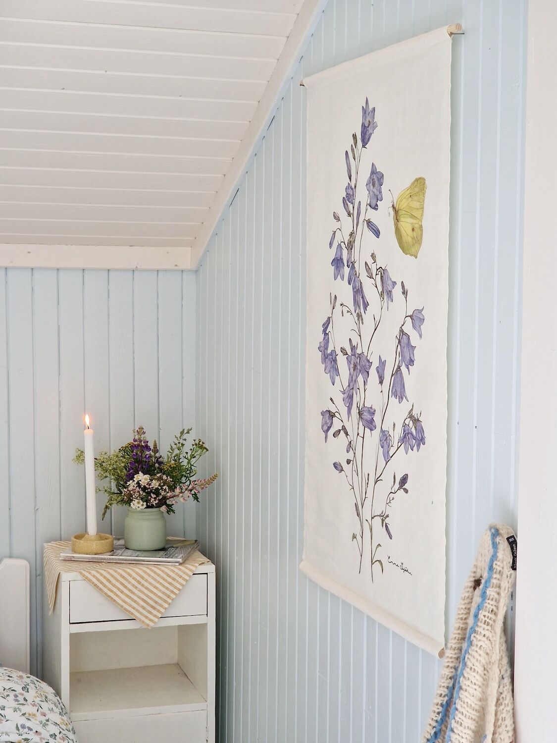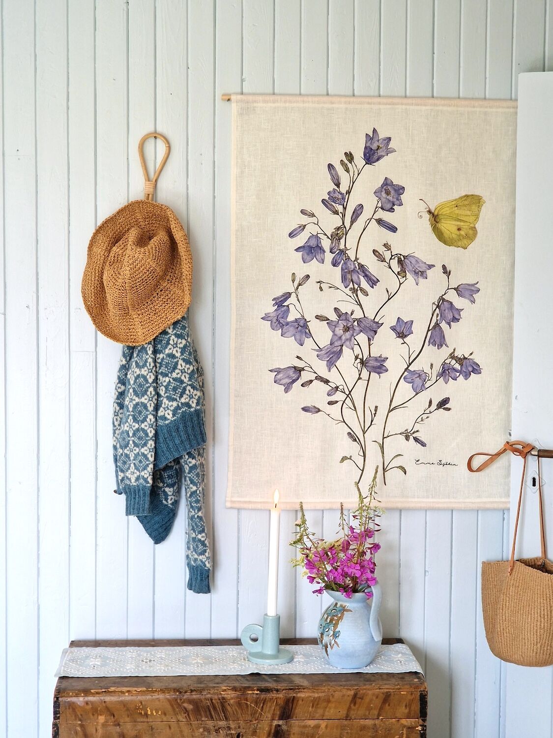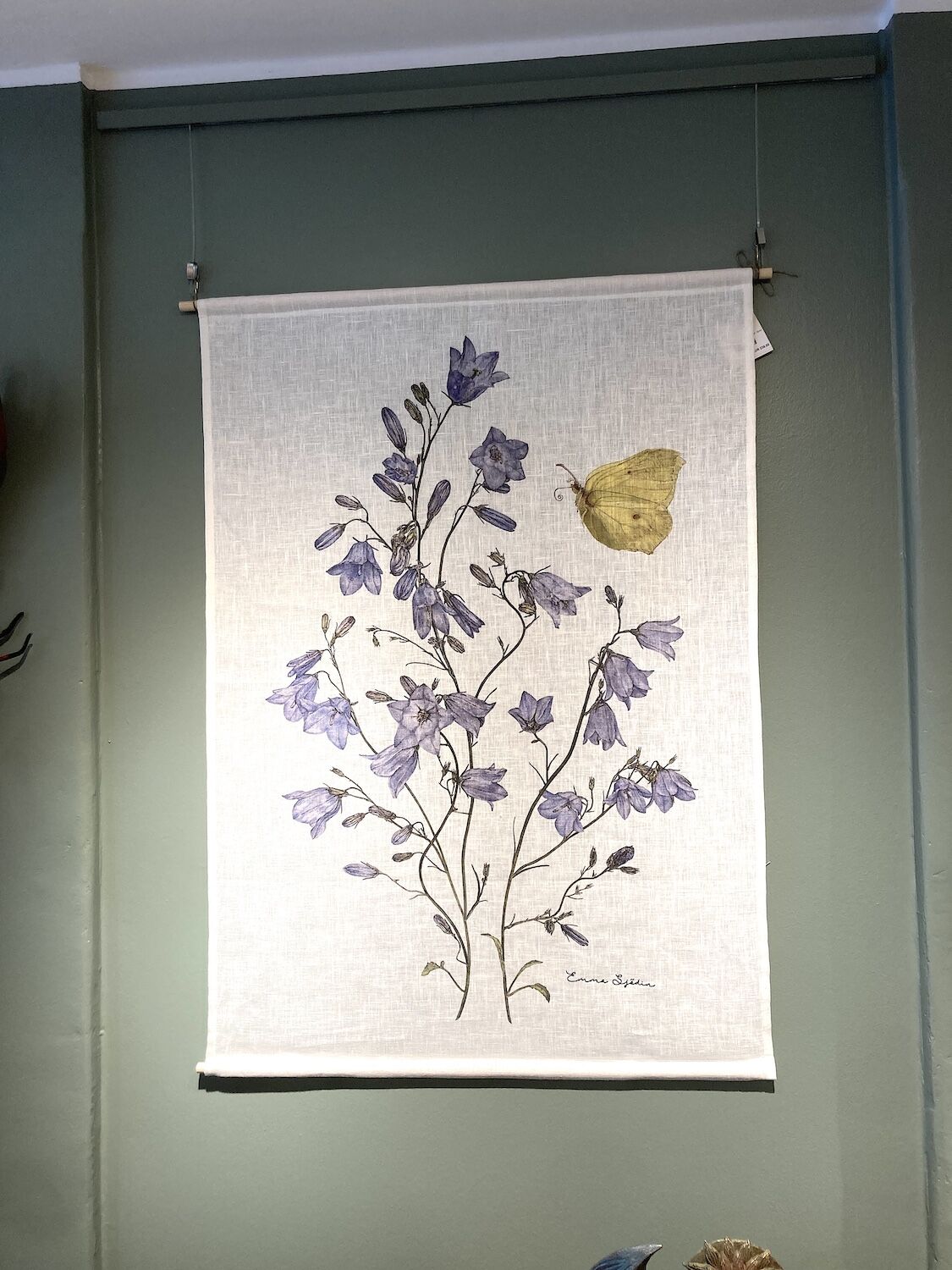 Die Kollektion 'Glockenblumen & Zitronenfalter' gehört zu Emma Sjödins botanischer Serie der skandinavischen Wildblumen und schönen Insekten. Emma hat hier ihre Favorittechniken Bleistift und Aquarell kombiniert und detailreiche, zeitlose Bilder erschaffen. Das Ziel war, den Aufbau der Knospen, die aufgeblühten Blumen, den Stamm und die Beschaffenheit der Blätter auf künstlerischem Wege zu zeigen. Die Modelle stammen aus eigenen Feldstudien und Kompositionen von Blumen der Sommerwiesen in Småland rund um ihr Anwesen. Der Zitronenfalter auf dem Bild fliegt von März bis September und labt sich mit Vorzug an blauem und rotem Blütennektar.
